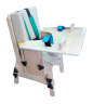 Опора для сидения с изменяемым углом наклона подножки и прямой спинкой до плеча необходима для пациентов с рекурвацией колена, что расслабляет мышцы и снижает спастику. Для устранения перекреста ног и для пассивной растяжки абдукционных мышц служит регулируемый и съемный абдуктор, предусмотрена фиксация стоп. Тазобедренная часть тела фиксируется набедренным креплением, а грудная — регулируемым креплением «жилетик». К сидению прилагается столик, прикрепляемый на липучках к подлокотникам. Ножки сидения и подлокотники регулируются по высоте. Опора установлена на колесах, задняя пара колес имеет тормоза. Мягкие элементы на поролоне, обтянуты искусственной кожей.